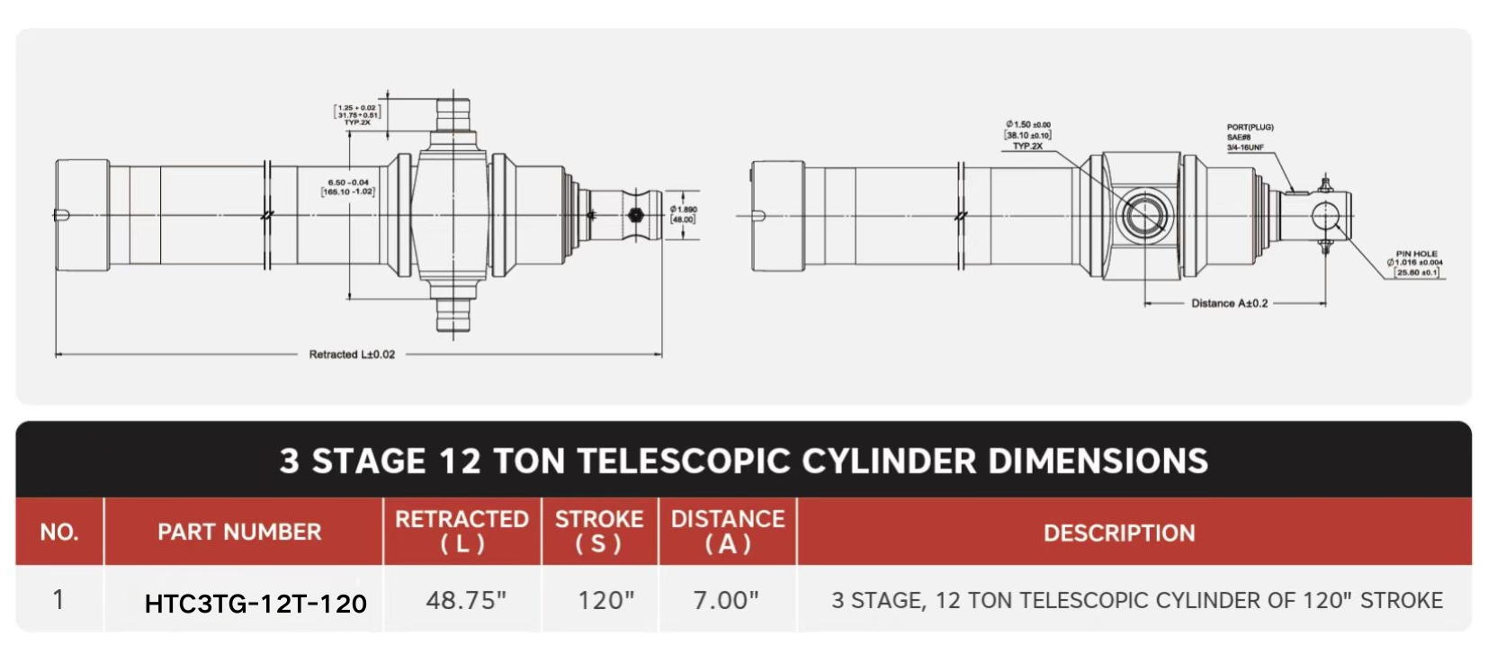 "HTC3TG-12T-120", 3 चरण, 120 को 12 टन" स्ट्रोक टेलिस्कोपिक सिलिन्डर
