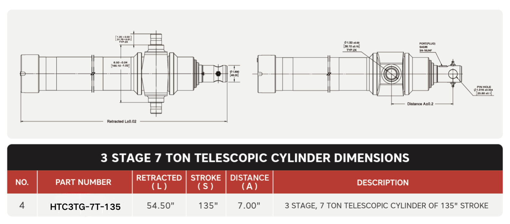 "HTC3TG-7T-135", 3 स्टेज, 135 को 7 टन" स्ट्रोक टेलिस्कोपिक सिलिन्डर